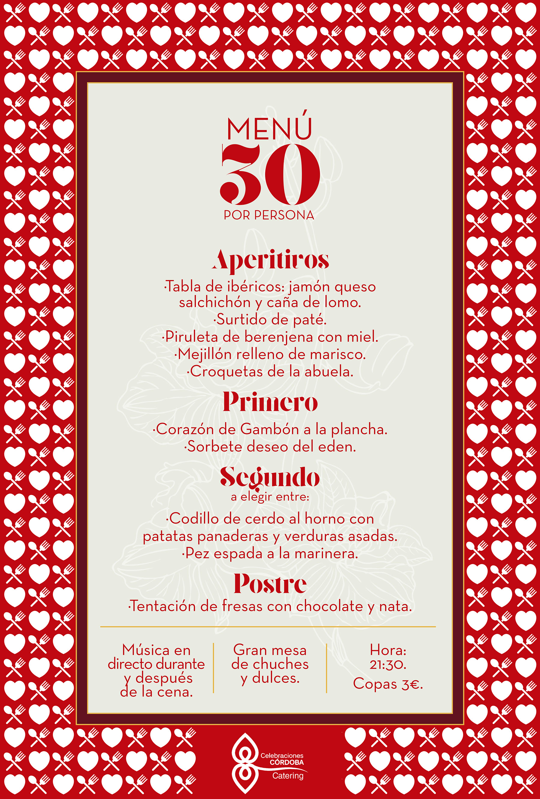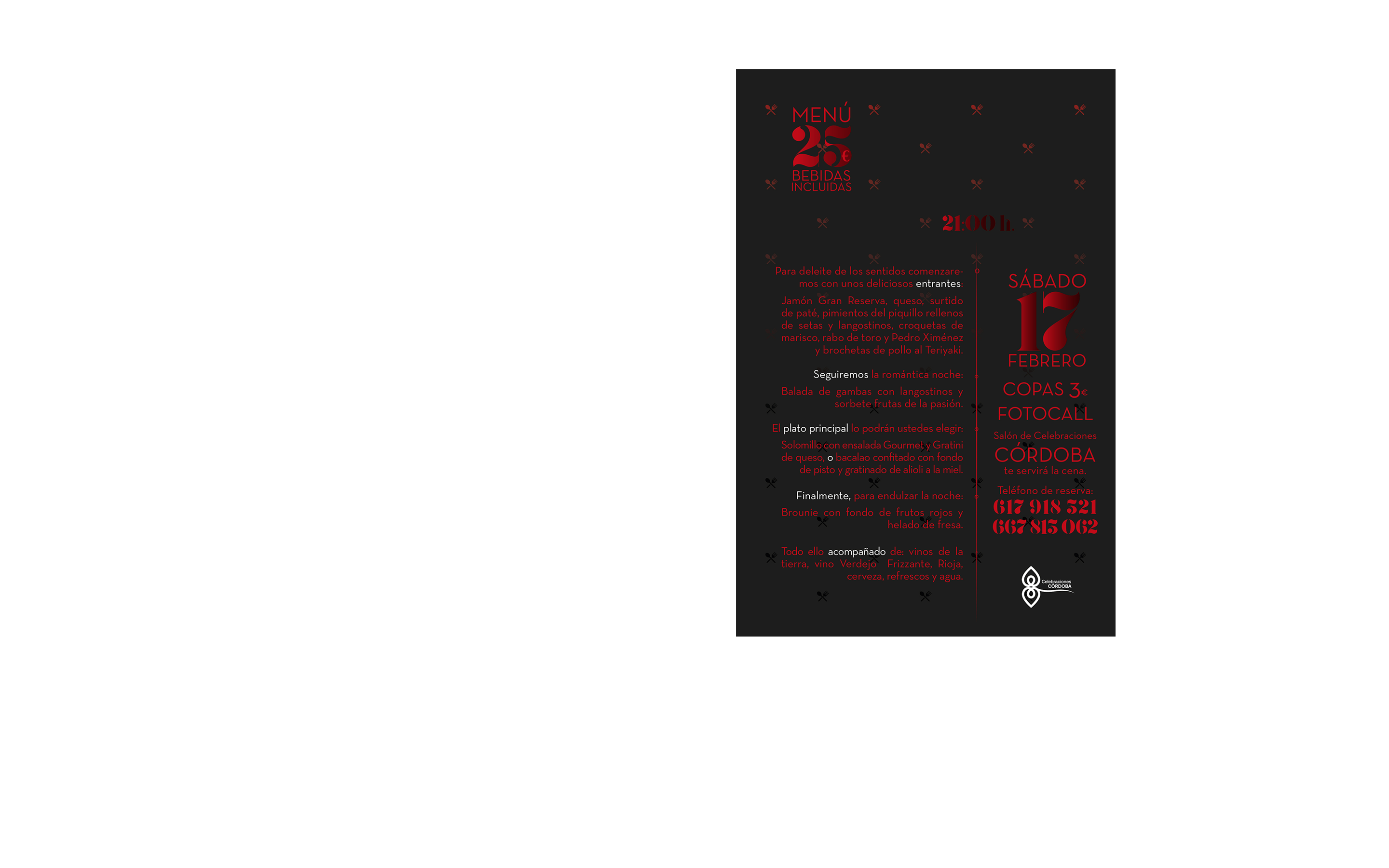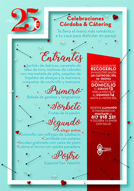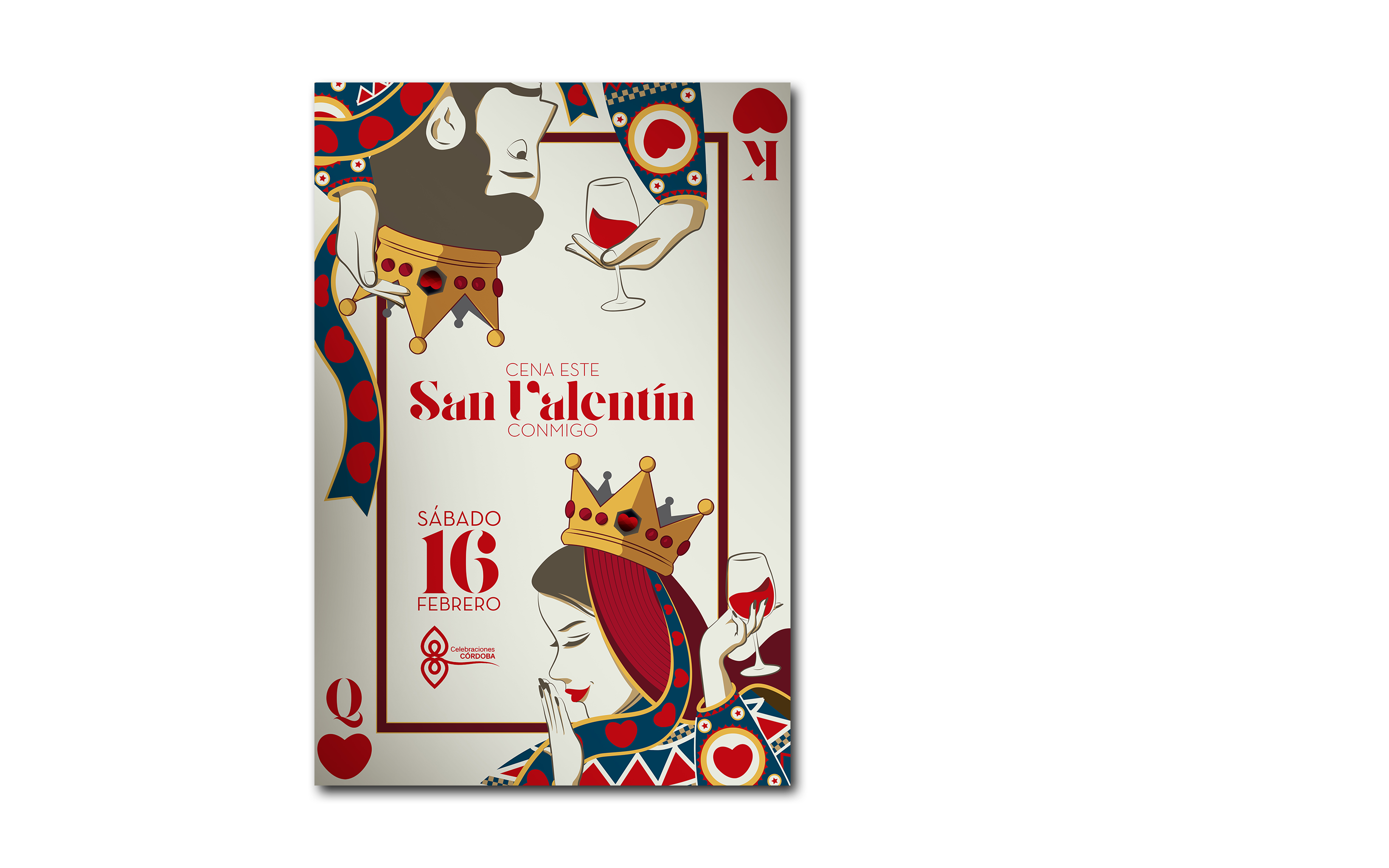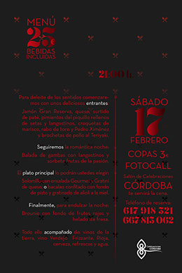 Los Salones de Celebraciones Córdoba organizan todos los años con motivo del día de San Valentín una cena muy especial en sus instalaciones, con decoración, música y menús especialmente elegidos y pensado para el romántico día. El proyecto anual consiste en la creación de cartelería publicitaria, su adaptación a redes sociales y la maquetación del menú. A consecuencia de la pandemia del COVID-19 se suspendió la actividad presencial, por lo que en 2021 la cena se sirvió a domicilio, creando un precedente interesante para futuros años.