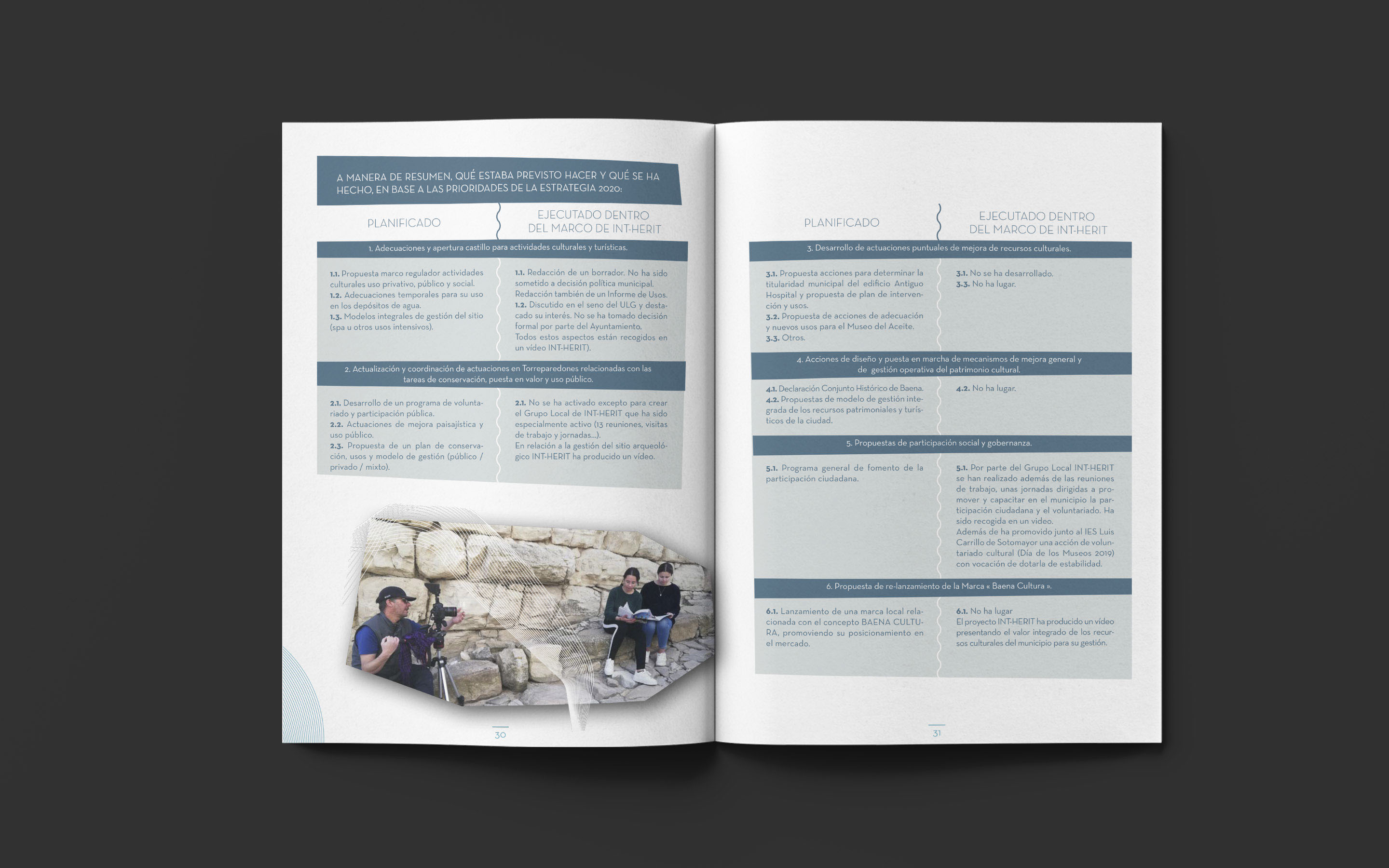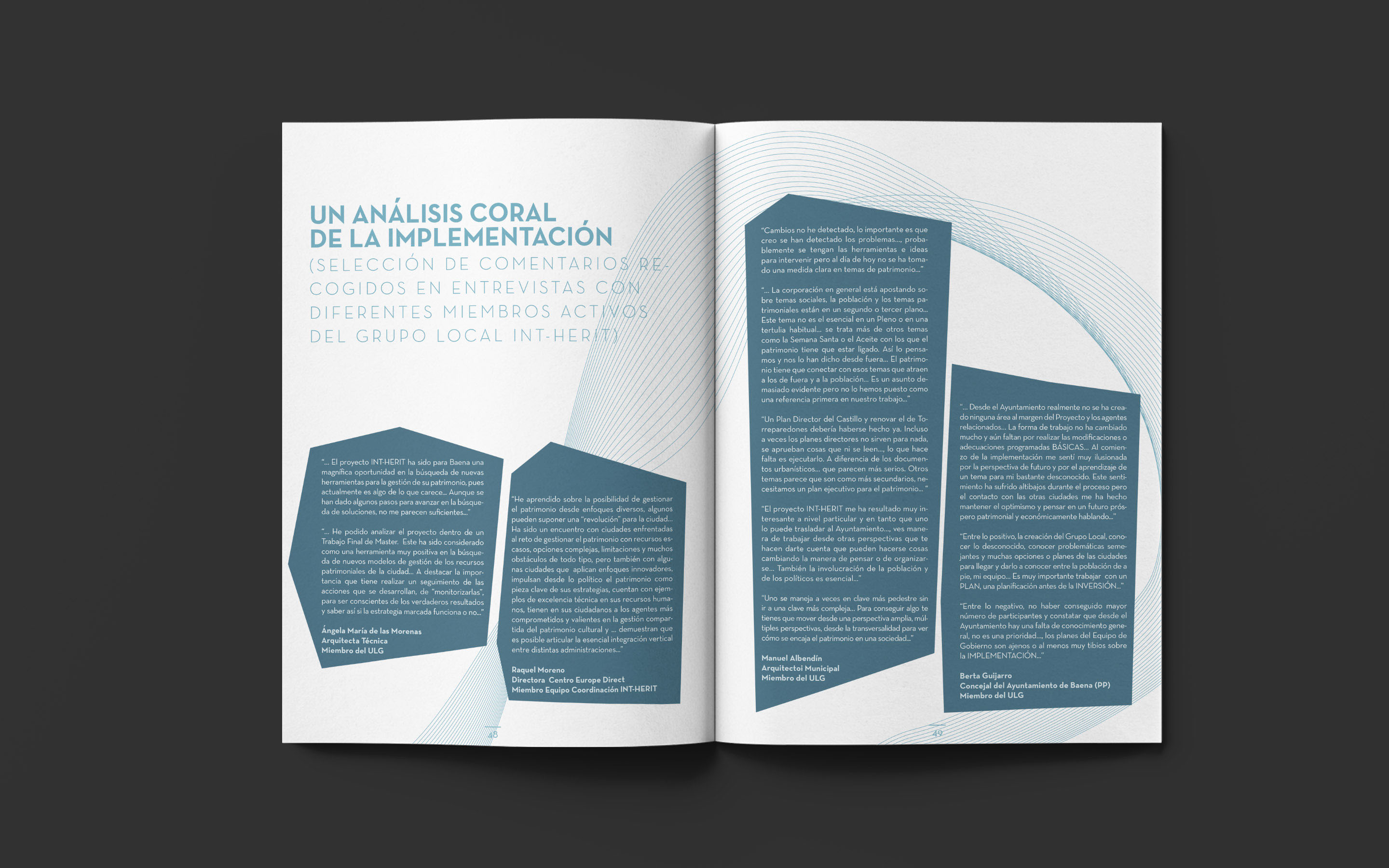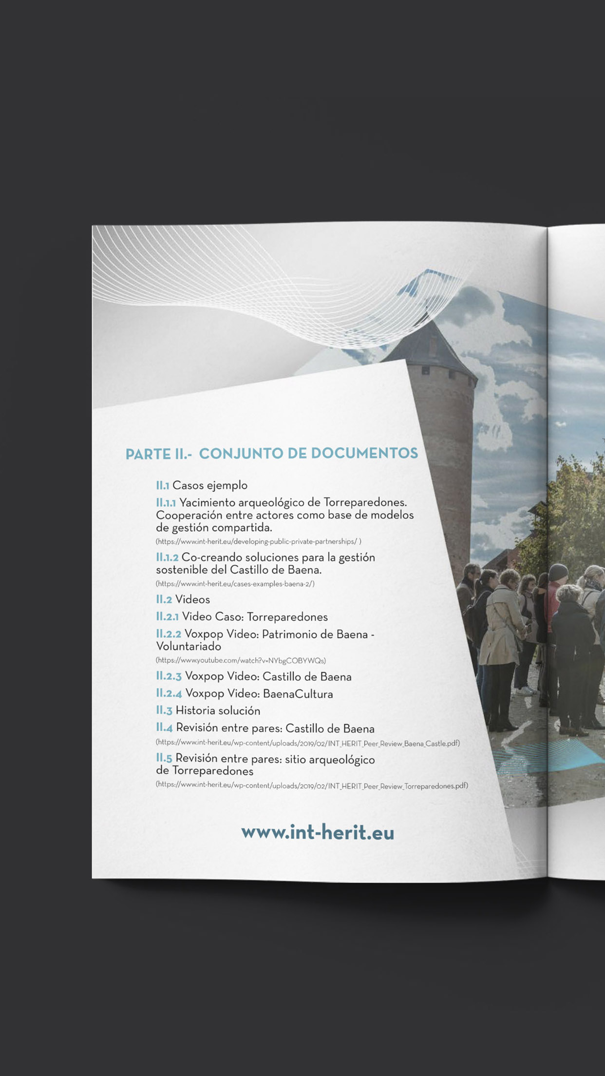 El proyecto europeo INT-HERIT consta de varias fases, entre ellas se encuentra el MARCO OPERATIVO DE IMPLEMENTACIÓN, el cual nos ocupa. Se trata de un dossier en el que se incluyen todas las actividades realizadas en el marco del proyecto INT-HERIT en Baena. Hemos realizado la maquetación del proyecto y el diseño de las tablas explicativas, esquemas e infografías para conseguir hacer la lectura más amena.