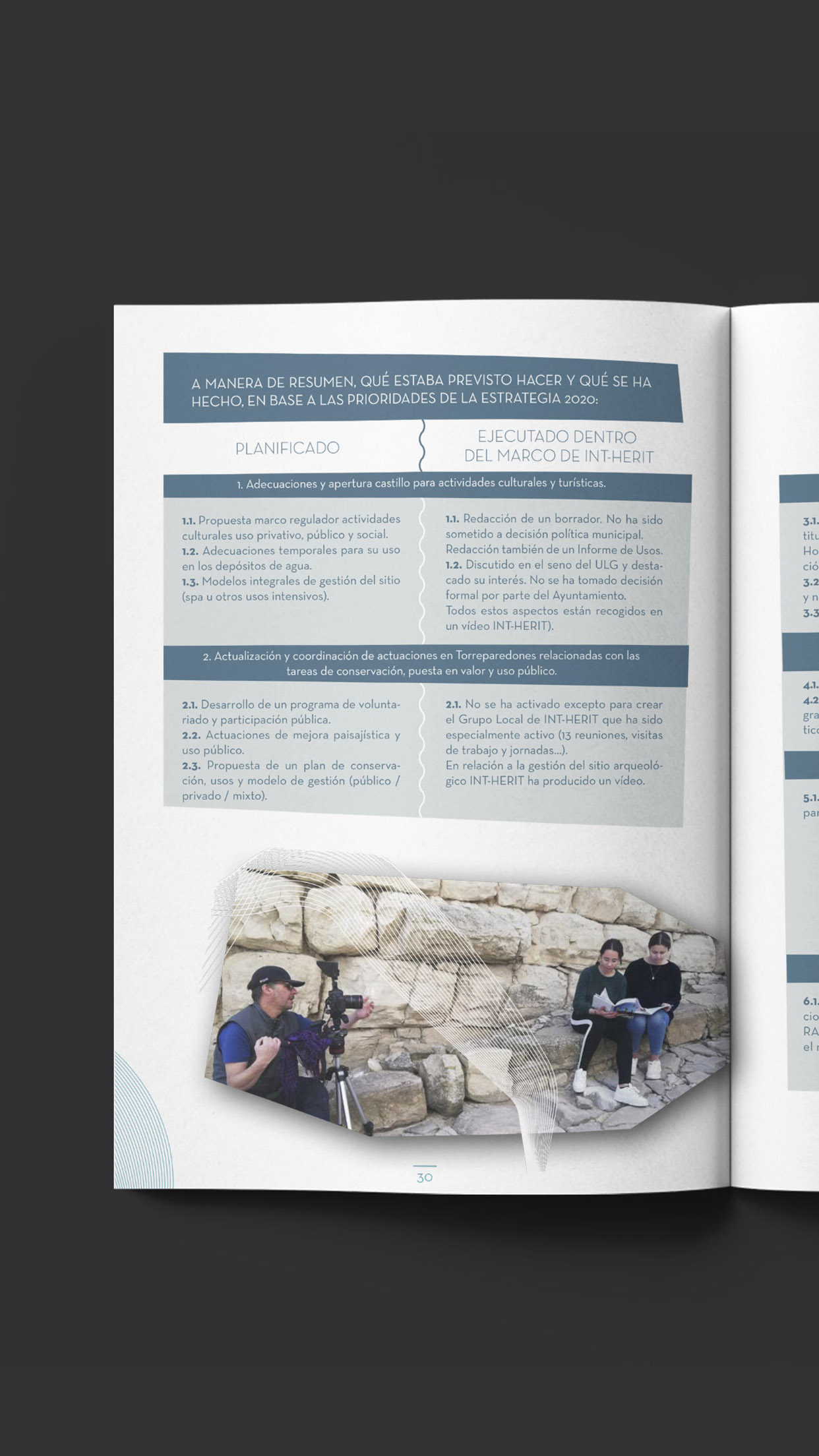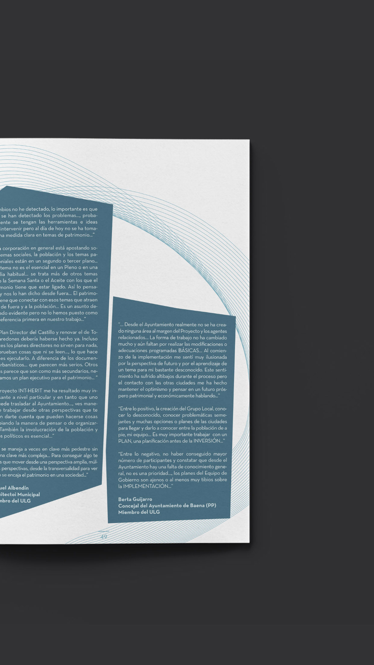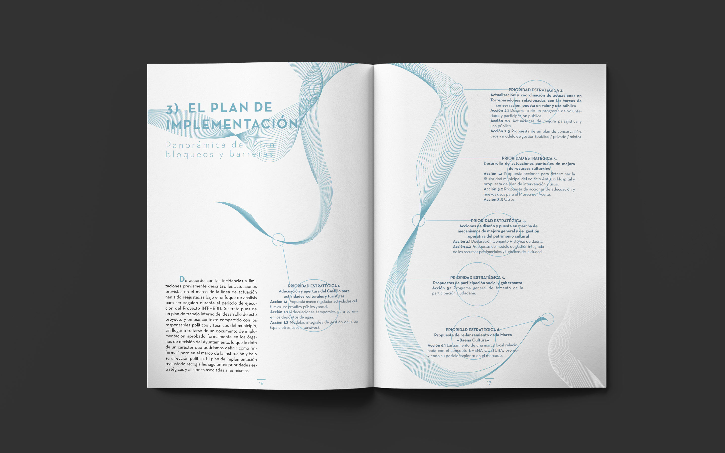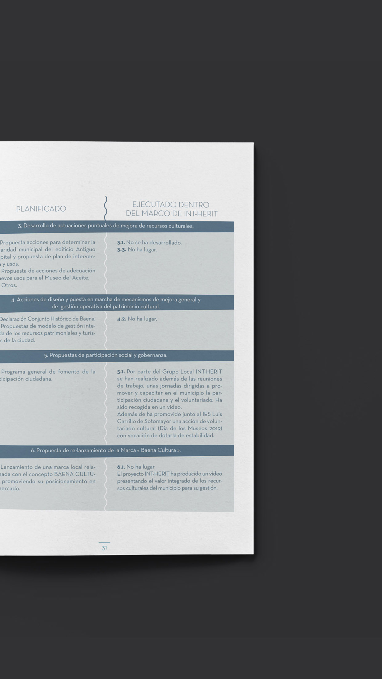 El proyecto europeo INT-HERIT consta de varias fases, entre ellas se encuentra el MARCO OPERATIVO DE IMPLEMENTACIÓN, el cual nos ocupa. Se trata de un dossier en el que se incluyen todas las actividades realizadas en el marco del proyecto INT-HERIT en Baena. Hemos realizado la maquetación del proyecto y el diseño de las tablas explicativas, esquemas e infografías para conseguir hacer la lectura más amena.