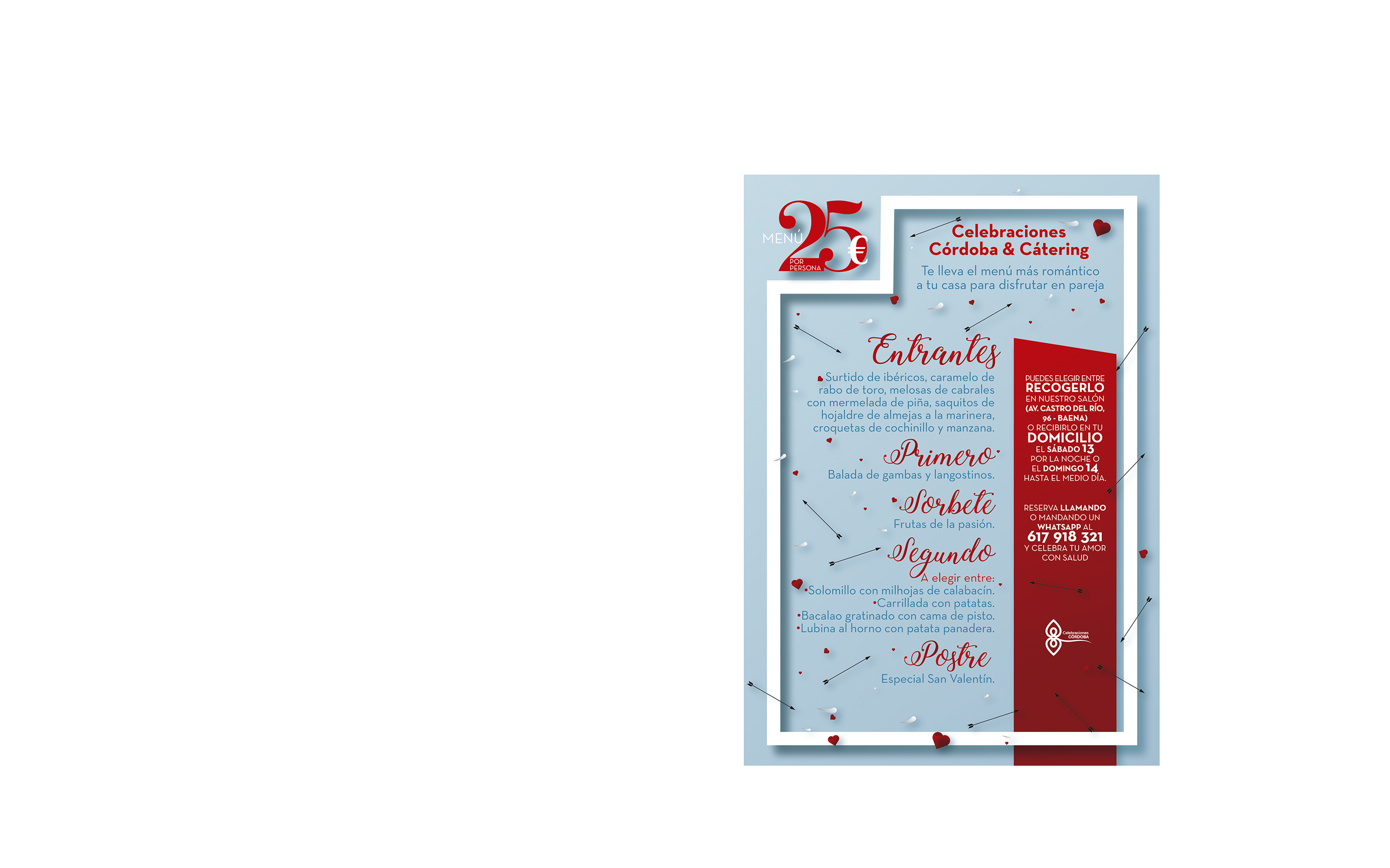 Los Salones de Celebraciones Córdoba organizan todos los años con motivo del día de San Valentín una cena muy especial en sus instalaciones, con decoración, música y menús especialmente elegidos y pensado para el romántico día. El proyecto anual consiste en la creación de cartelería publicitaria, su adaptación a redes sociales y la maquetación del menú. A consecuencia de la pandemia del COVID-19 se suspendió la actividad presencial, por lo que en 2021 la cena se sirvió a domicilio, creando un precedente interesante para futuros años.